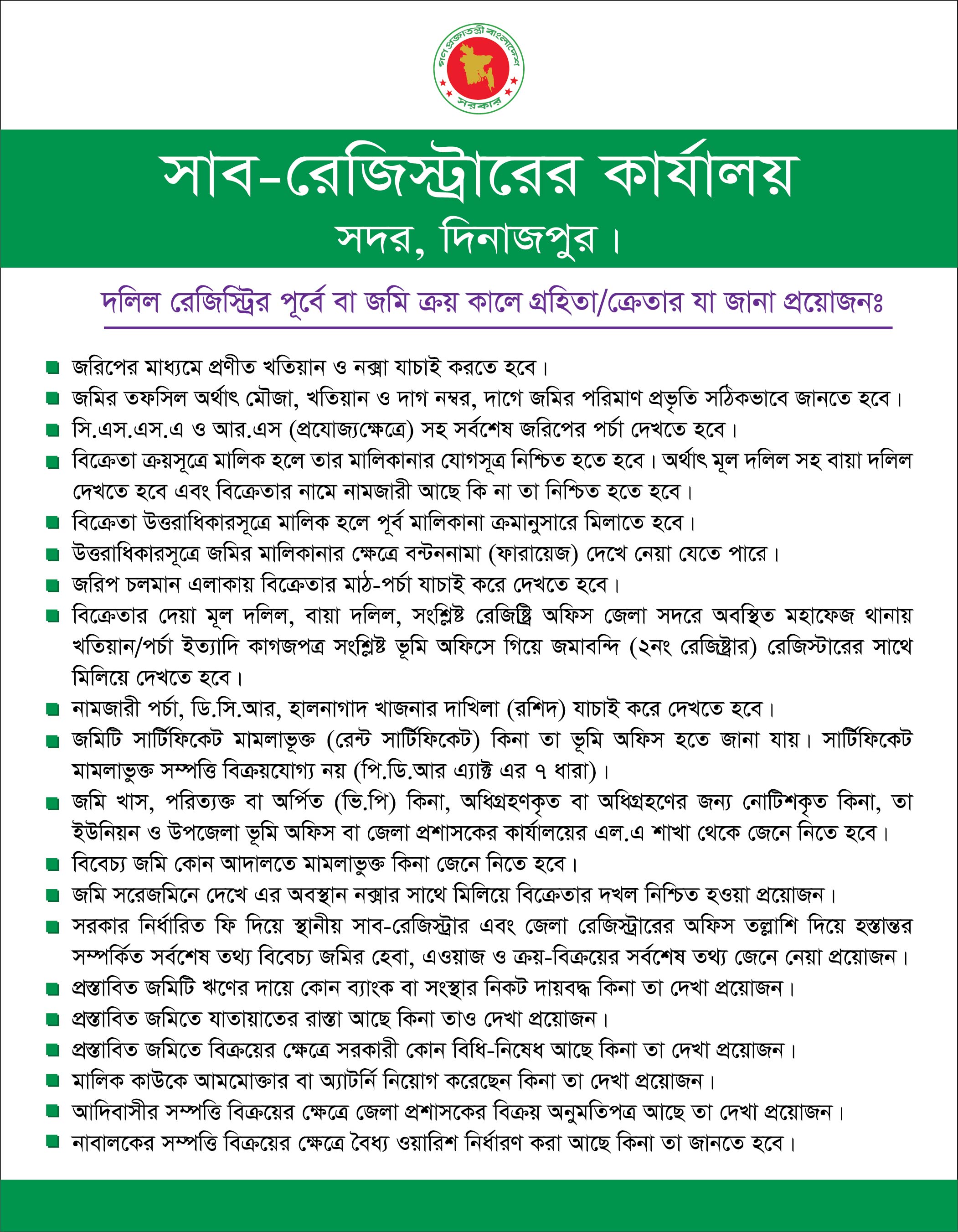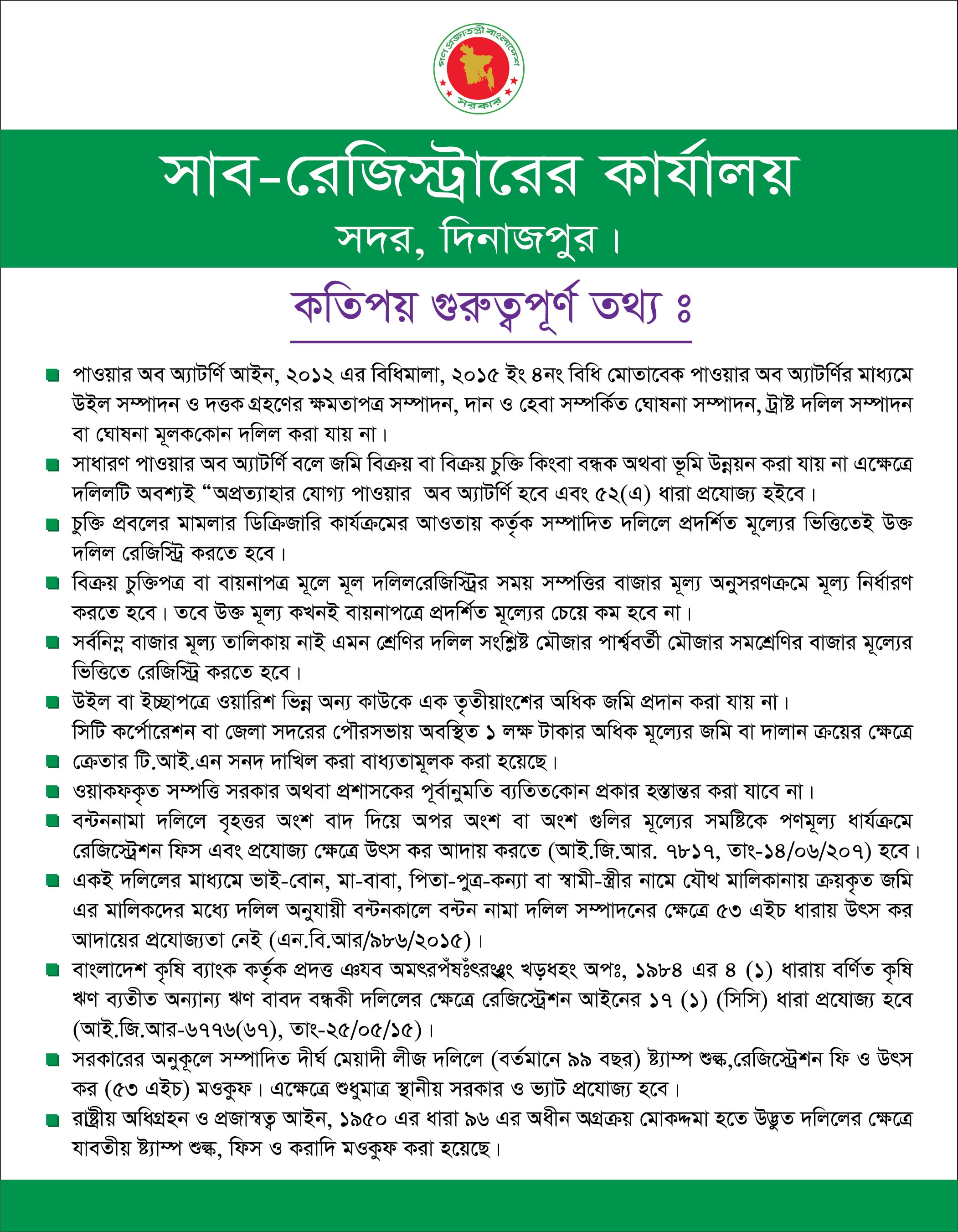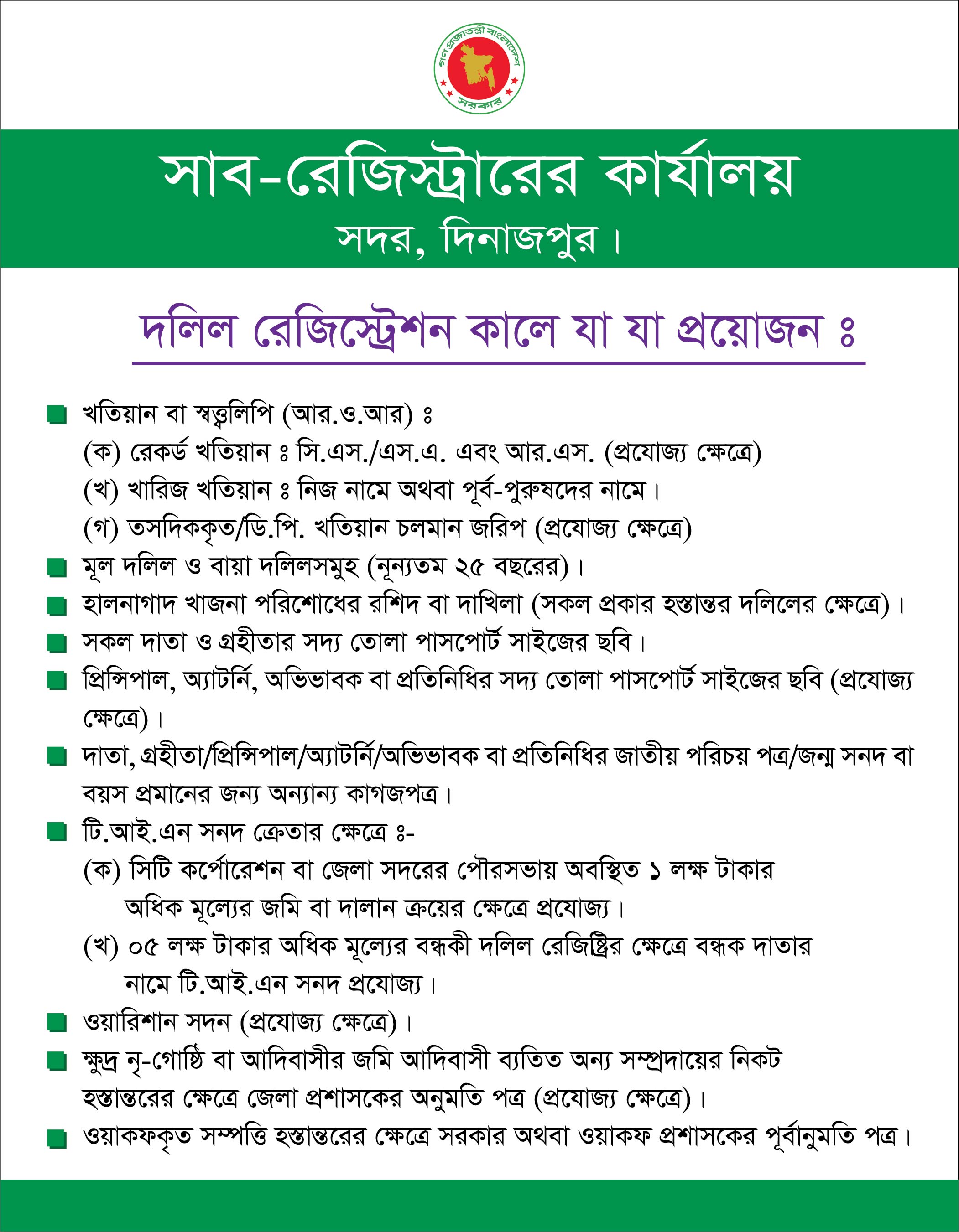 সাব-রেজিস্ট্রার এর কার্যালয় কর্তৃক প্রদেয় সেবার বিবরণ