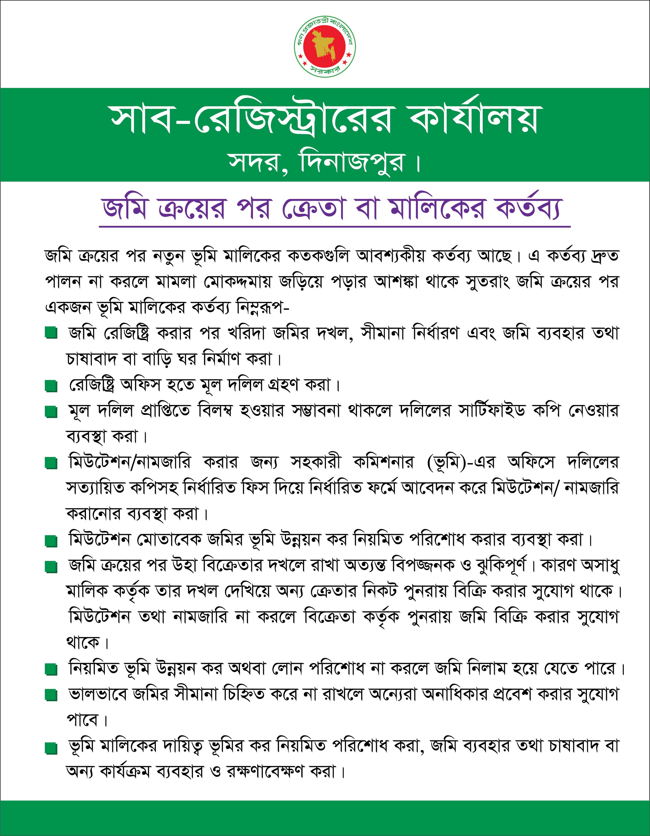 | ৫ | দায়মুক্ত (Non-Encumbrance) সনদ সংগ্রহে সহায়তা গ্রহণ। | ১ দিন | -ঐ- |